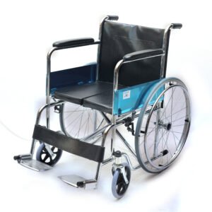 The wheelchair includes push-to-lock rear wheel brakes, attendant push handles, and a compact foldable design, making it convenient for home care, hospitals, clinics, and travel. The 18-inch seat width, solid construction, and black–silver finish make it a dependable choice for long-term use.